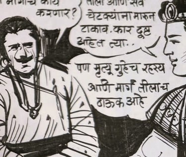 आई मला कुठं घेऊन जानार हे मला ठाव व्हतं. सारं गाव अंधारात घोंगडं पांघरलेल्या म्हाताऱ्या सारखं पडून व्हतं. आमी सुगंदाबाईच्या घराकडं चाललो व्हतो. तीच घर थेट गावाच्या त्या टोकाला व्हतं!
